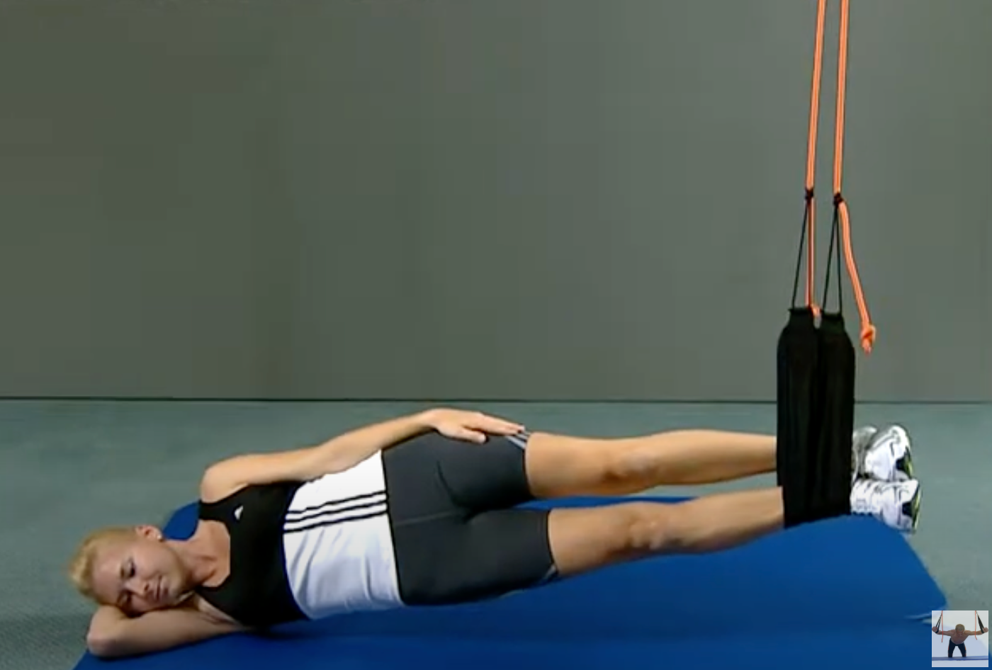 - liegend in Seitlage: Mit den Füßen in unterschiedlichen Hebellängen seitlich in den Schlingen, angewinkelter Arm mit Ablegen des Kopfes auf den Oberarm.