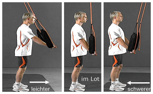 - Daneben spielt der Abstand zum Aufhängepunkt eine Rolle: Näher am Lot ist die gleiche Übung mit dem Schlingentrainer leichter als ein Stück hinter dem Aufhängepunkt.