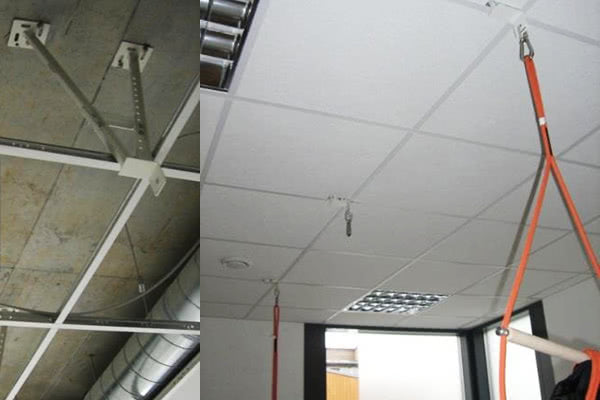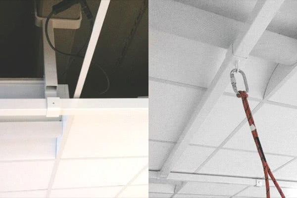 Über jeder abgehängten Decke befindet sich ein tragende Decke. An dieser lässt sich eine Aufhängemöglichkeit für z.B. den SlingTrainer montieren. Die Öse zur Befestigung ragt dabei nur durch ein kleines Loch innerhalb der sichtbaren Decke.